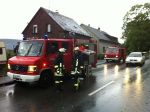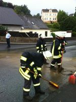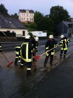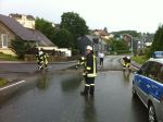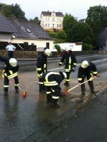 Auf dem Weg zurück ins Feuerwehrhaus vom umgestürzten Baum auf der B 62 meldete uns die Polizei einen weiteren Unwetterschaden. An der Straßenecke Hauptstraße/Friedhofstraße bedeckten ca 15cm Schotter, der vom starken Regenfall weggespült wurde, die Straße. Die Straße wurde gereinigt und man rückte wieder ins Feuerwehrhaus ein. |